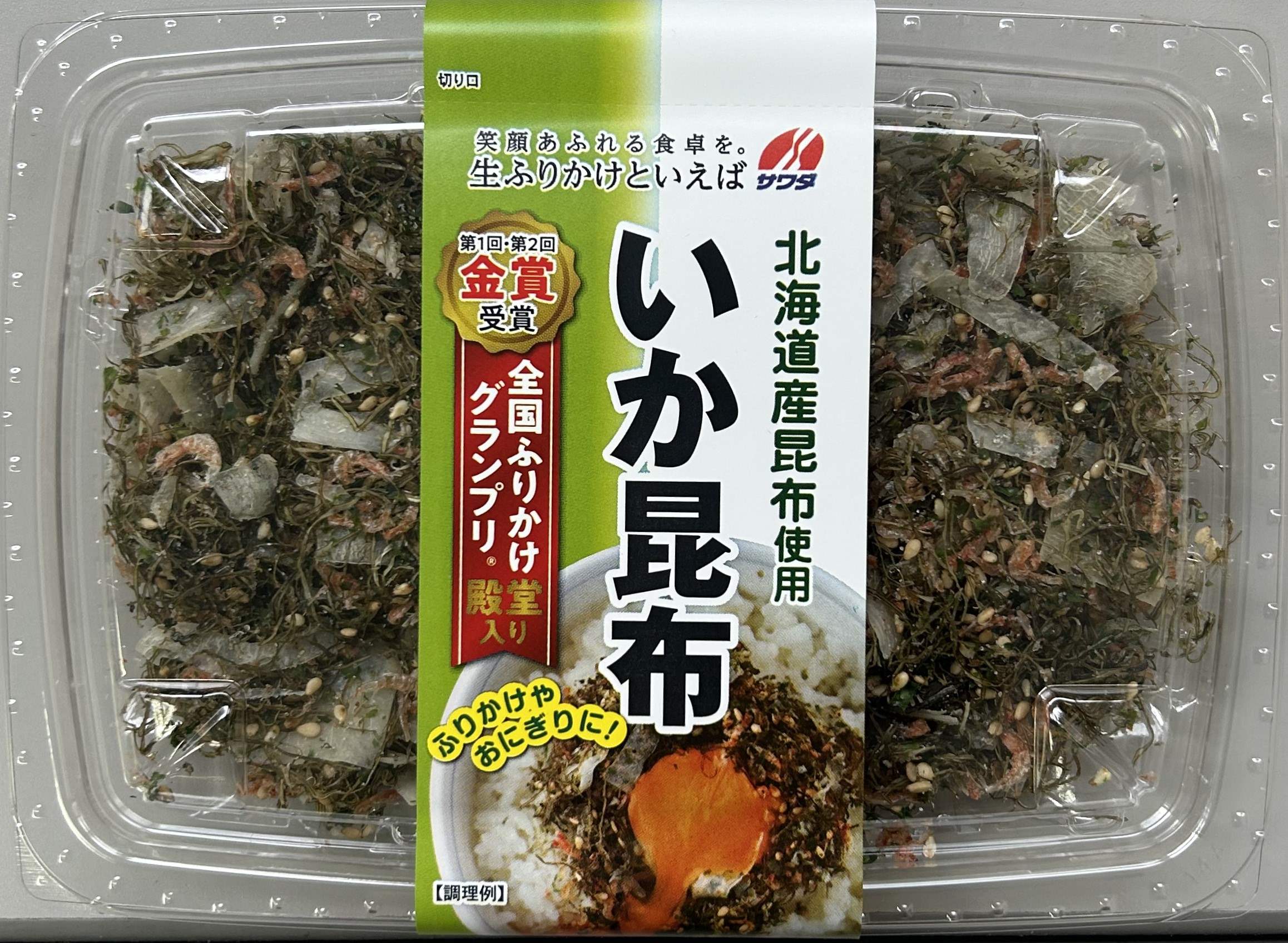 原材料名 | 調味昆布(昆布(北海道産)、醸造酢、還元水飴)、調味いか(いか、砂糖、食塩)、ごま、ツノナシオキアミ、砂糖、食塩、アオサ/調味料(アミノ酸等)、ソルビット、(一部にいか・ごまを含む) | |