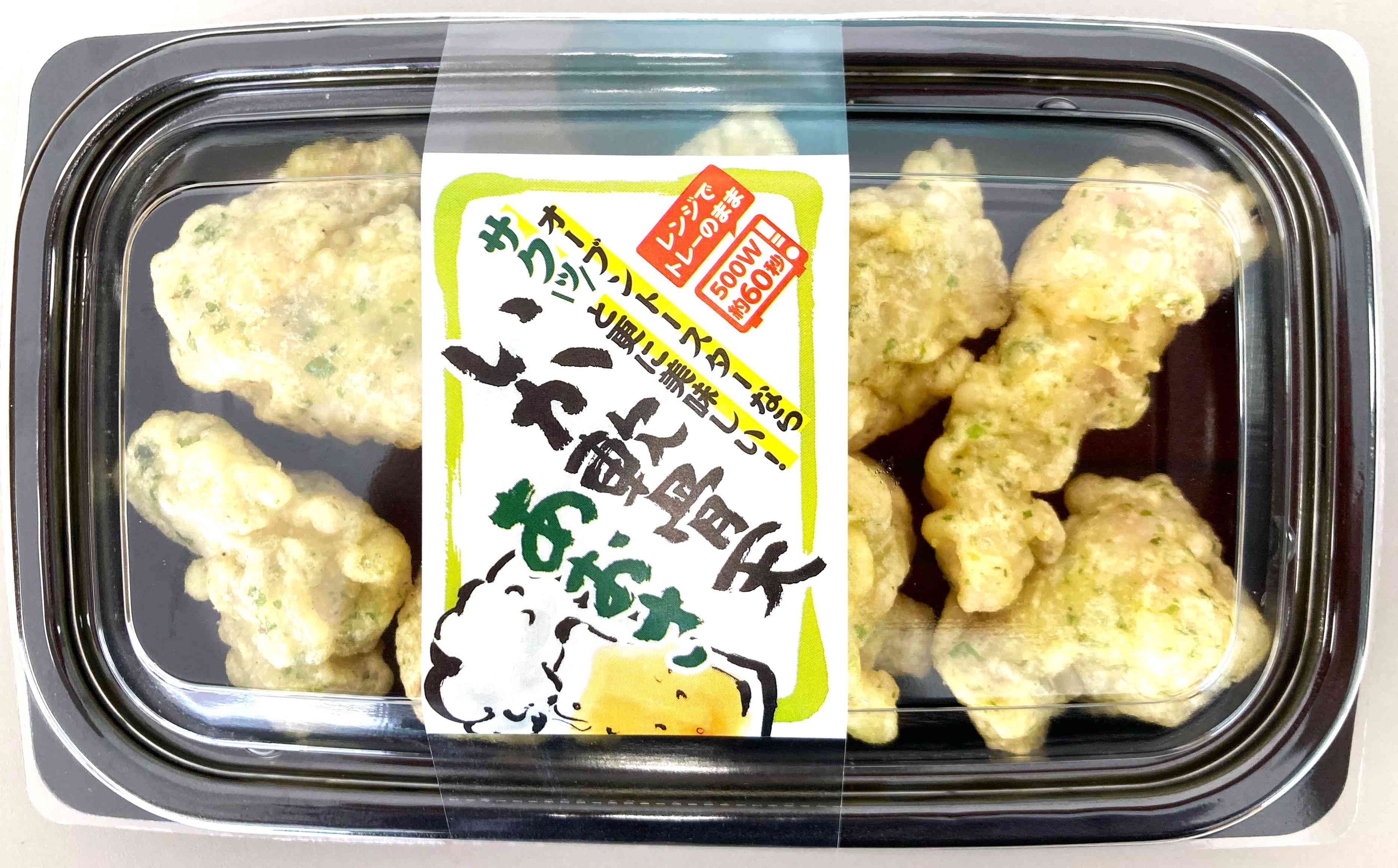 調味いか軟骨(いか、食塩)、天ぷら粉(小麦粉、でん粉、米粉、その他)、大豆油、アオサ/増粘剤(加工でん粉)、調味料(アミノ酸)、乳化剤、膨張剤、着色料(カロチノイド、ウコン)、(一部に小麦・いか・大豆を含む)