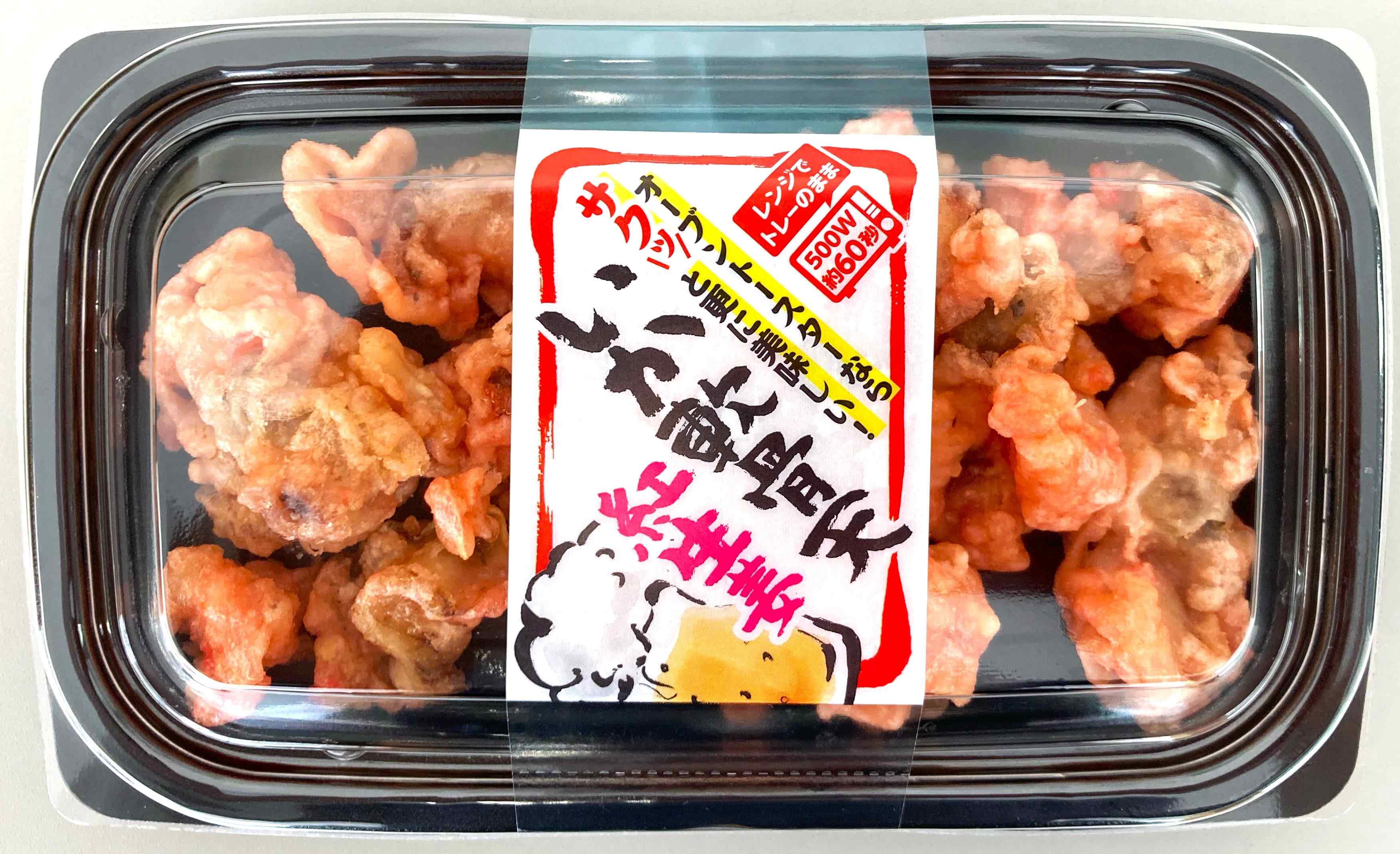 | 原材料名 | 調味いか軟骨(いか、食塩)、天ぷら粉(小麦粉、でん粉、米粉、その他)、紅生姜、大豆油/増粘剤(加工でん粉)、酸味料、膨張剤、乳化剤、調味料(アミノ酸)、着色料(カロチノイド、ウコン、赤102)、保存料(ソルビン酸K)、(一部に小麦・いか・大豆を含む) |