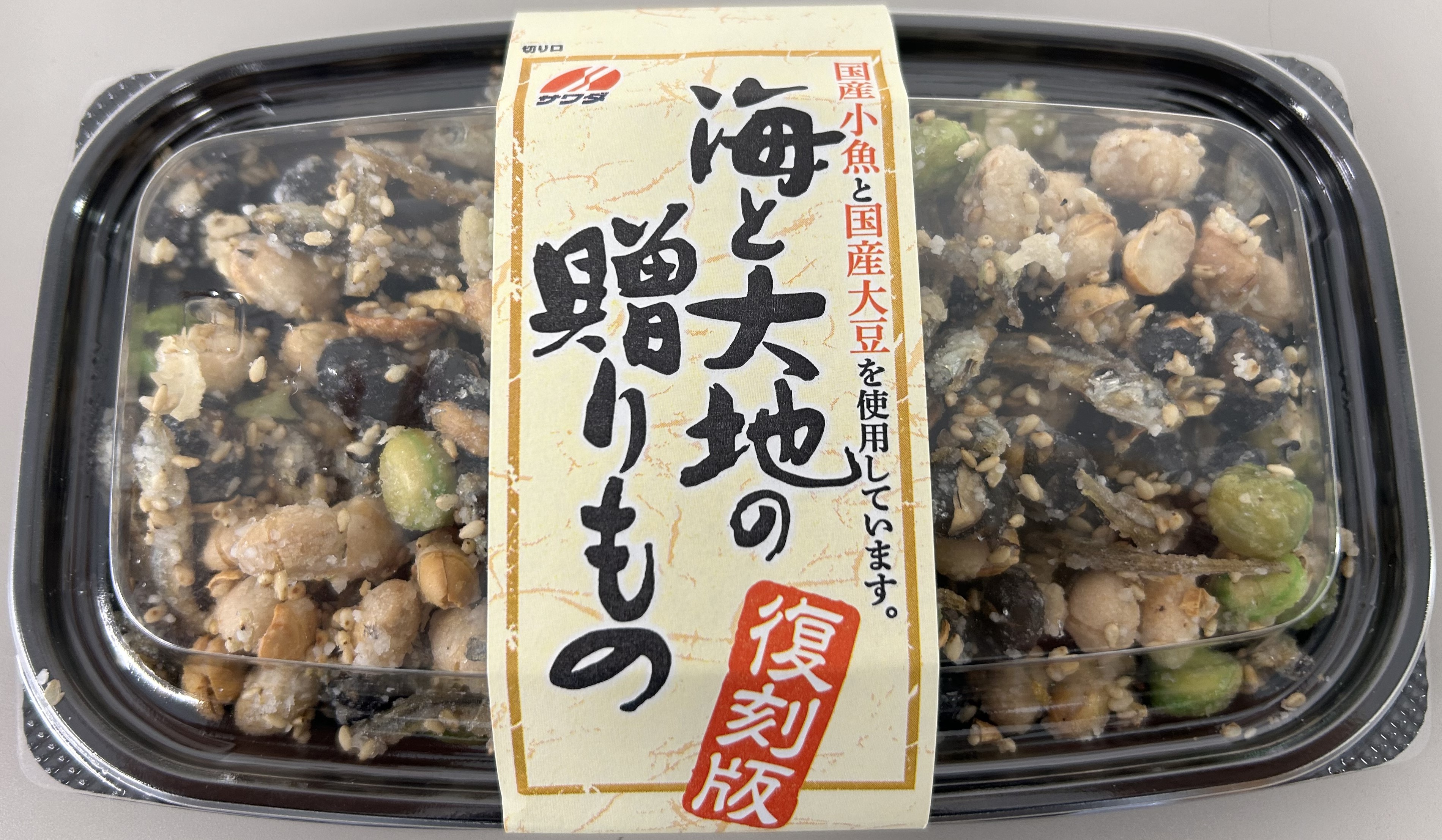 | 原材料名 | 煎り大豆(大豆(国産)(分別生産流通管理済み))、調味小魚(片口いわし(国産)、砂糖、その他)、還元水飴、砂糖、グリーンピース(えんどう豆、植物油、食塩)、ごま、餅粉加工品(餅粉、澱粉)/ソルビット、調味料(アミノ酸等)、着色料(青1、黄4)、(一部にごま・大豆を含む) |